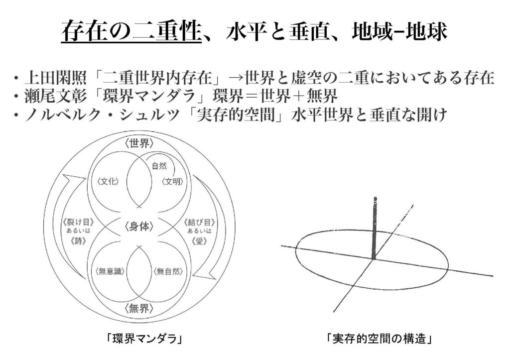 哲学の分野ですと、上田閑照氏が二重世界内存在ということを言ってまして、人間は世界においてあるとともに、その背後にある見えないところにおいてもあるよということを言っていたり、 先ほどの瀬尾氏は環界マンダラという、この左下にあるような図を掲げて、人がいるところの総体を環界と名付けてるんですが、それは世界と無界が重なり合う場だということを言っています。あと、ノルベルグ・シュルツという人が実存的空間ということを掲げていて、右下にある図のように水平的な領域があるとともに、その中心である場所からは垂直な開けが導かれるということを言っていて、水平世界、垂直世界の二重性であるということを述べています。こういったふうに人間の存在が従前であるために二重でなきゃいけないって話がありまして、ただなんとなく、別々なものが二重であるというのではなくてですね、あくまで水平なものと垂直が二重をなすということが重要だということが示されてます。