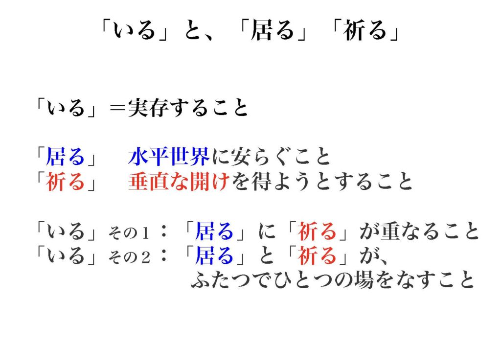 ここで、「実存」という言葉をちょっと読み替えてですね、これをひらがなの「いる」とした時に、「いる」ということは「実存」だとします。そこには、水平成分と垂直成分があるわけなので、それを「いる」に対応して規定していきますと、 1つは漢字の「居る」、「居室」の「居」ですね。「居る」ということで、これは、水平世界で安らいでいることという風に捉えてます。もう1つは「祈る」という行為ですが、これは垂直な開けを得ようとすることという風に考えています。そうなった時に2つに分けたものから、改めてひらがなの「いる」というのを見た時に、どういうことが言えるかと言いますと、 1つはですね、この水平に漢字の「居る」というとこに「祈る」という行為が重なって、完全一者になっているということがあるかと思います。もう1つはですね、「いる」というものが、いわゆる漢字の「居る」という場所と「祈る」場所というのが用意されていて、 集落みたいなもんですね。それが2つで1つになって、分かれてるんだけれども、それが相補って、2つで1つの場を成すタイプがあるかという風に思ってます。