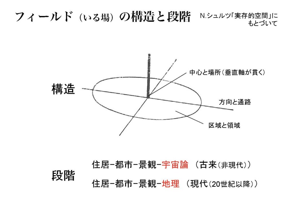 ここはノルベルク・シュルツに出てきていただいて、彼がフィールドの構造をやや再編しているんですが、概ね間違えじゃない、ちょっと載せてますけれども、 彼は構造を絵で描いています。先ほど示したこのしょぼい絵なんですが、円盤みたいなものがあって、真ん中に中心があって、垂直軸がぴょんって出ていますっていうことで、この構造が実存的空間の構造で、これがある限り、人は実存できますよみたいなことを言っています。ただし、もう1つ、シュルツが言っているこれには段階があって、これはちょっとややこしいんですよね。現代を除くと、段階というのは住居、都市、景観、あと、最後に、宇宙論的段階というのは基本的にはありましたということを言っていて、ただし、20世紀以降は人類が共有できる宇宙論もありゃしないから、これはもう地理の段階になってしまうんだ、という風になっています。なので、段階に関しては、 圧倒的長い時間を刻んできたのが上の方で、宇宙論で最後落ち着くものです。ただ、20世紀以降はそのようなものはありはしないから、地理的な認識として「ここはヨーロッパだよ」とか「ここは太平洋だよ」みたいなそういう地理的認識だけが最後にあるというんですね。ただし、シュルツはこのどの段階においてもこの上の構造が成り立つと言っています。