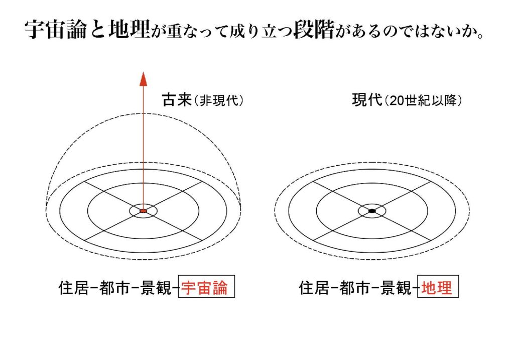 そういう時に本当に今の時代は地理的段階しかないのかと、あるいは大海原を見たり山の端の空を見た時に何かしら日常を越えたような感動を持つようなことが誰にしもあるとなると、それは地理的段階しかないとすると発生しない。だとしますと、その捉え方がやっぱり違っていて、現代においても宇宙論的なものと地理的なものが重なるような場というものがやはりあるんじゃないかという風に見ざるを得ないかと思います。そうなった時に、要は垂直を導く宇宙論的なものと、 あとは地理的認識のマックスとしての領域として地球というものがあげられるんじゃないかという風に捉えてます。これは一旦分離してしまった地理的段階と宇宙論的段階を総合したものが地球じゃないかという風に捉えています。その内側にある住居、都市、景観っていうのは地域の段階ということで変わらずでいいと思いますが、こうじゃない限りはどの段階でも垂直軸が立ち上がるということは不可能になります。なぜ立ち上がるのかというと、全ての段階の背後には地球があって、それが宇宙論に支えられて、垂直軸を導くからであるという風に捉えています。