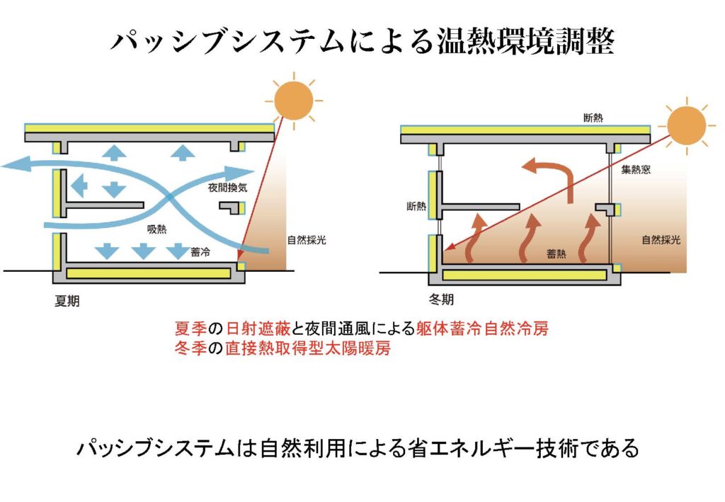 続きまして、ちょっと矢継ぎ早ですが、パッシブと地域−地球はどうなのかってことです。パッシブシステムというのは一般に日本のある地域だと基本これで、要は夏と冬、夏は日射の遮蔽をして、気温が下がる夜間に通風を施して躯体蓄冷冷房するという左のような図ですね。冬期においては太陽の高度が下がってくるので、南面大開口から集熱して、 蓄熱帯で熱を蓄えて放熱するというもので、 要は自然を利用して省エネルギーを獲得する技術だっていうことが一般的なことかと思います。