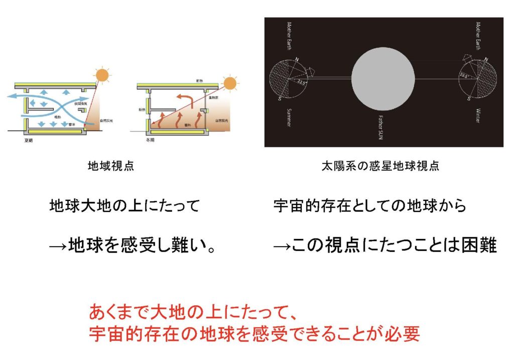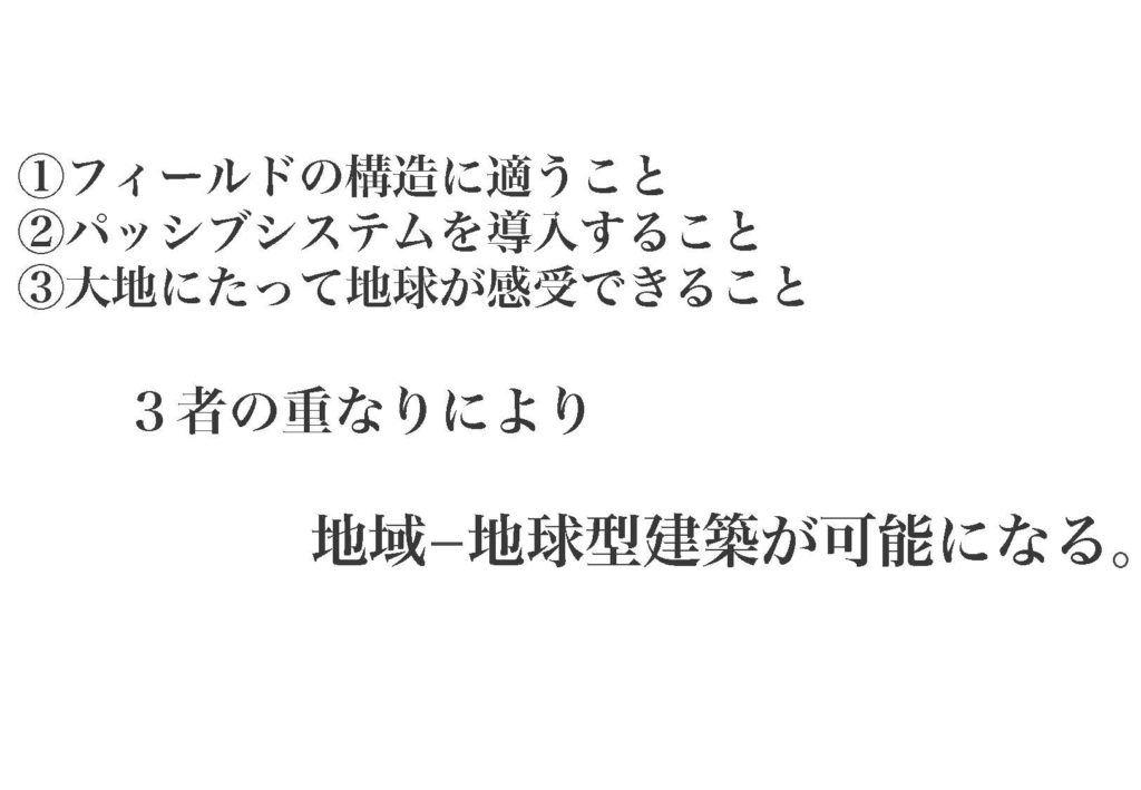 こうやって改めてまとめていきますと、地域−地球型建築を作る時に、まずはフィールドの構造に叶うということと、もう1個はパッシブシステムに温熱環境の調整だけじゃなくって、そこには根源的な自然、宇宙的存在としての地球を感受するということが織り込まれているので、それを導入すること、それは感受できないとしょうがないので、大地に立って地球を感受できるという3つが重なっていくことが大事だということに考えています。これによってようやく地域−地球型建築が可能になるという風に捉えております。