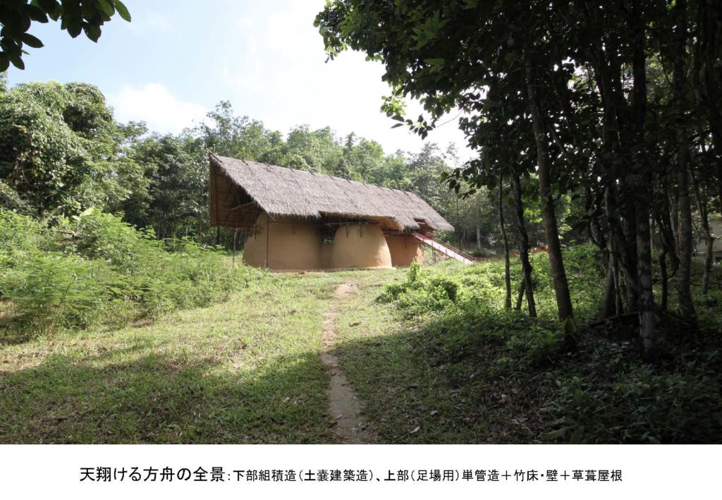 これに関しては、天翔ける方舟は学舎の名称で、虹の学校というタイとミャンマーの国境にある孤児院兼学校の学舎です。建築の条件なんですが、元々の条件と話し合いで決まった条件が重なって、この赤い4つの条件が定まりました。機能としては教室、遊び場ってあるんですが、孤児ということで色々心に痛みを抱えてる人たちが多いので、朝夕とお祈りをするということが定められてました。 性能としてはお金もほとんどないようなところだったので、 空調等の機械は入れられない状況ですから、タイの中で機械使わずに良好な室内環境を可能な限り実現するということが望まれてました。3つ文化的なことですが、これは伝統的な建築技術を継承できるのか。それは当然ながら継承したいということがあるんですが、それじゃどうしようもない部分は、有効と考えられる現在技術も導入します。あと、先ほどの祈りの空間があるのと同じなんですが、心的な機能としては子供たちの心の拠り所になってほしいということが願われてました。