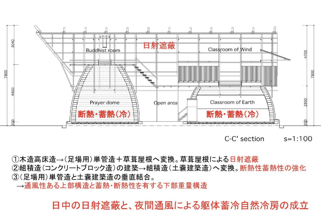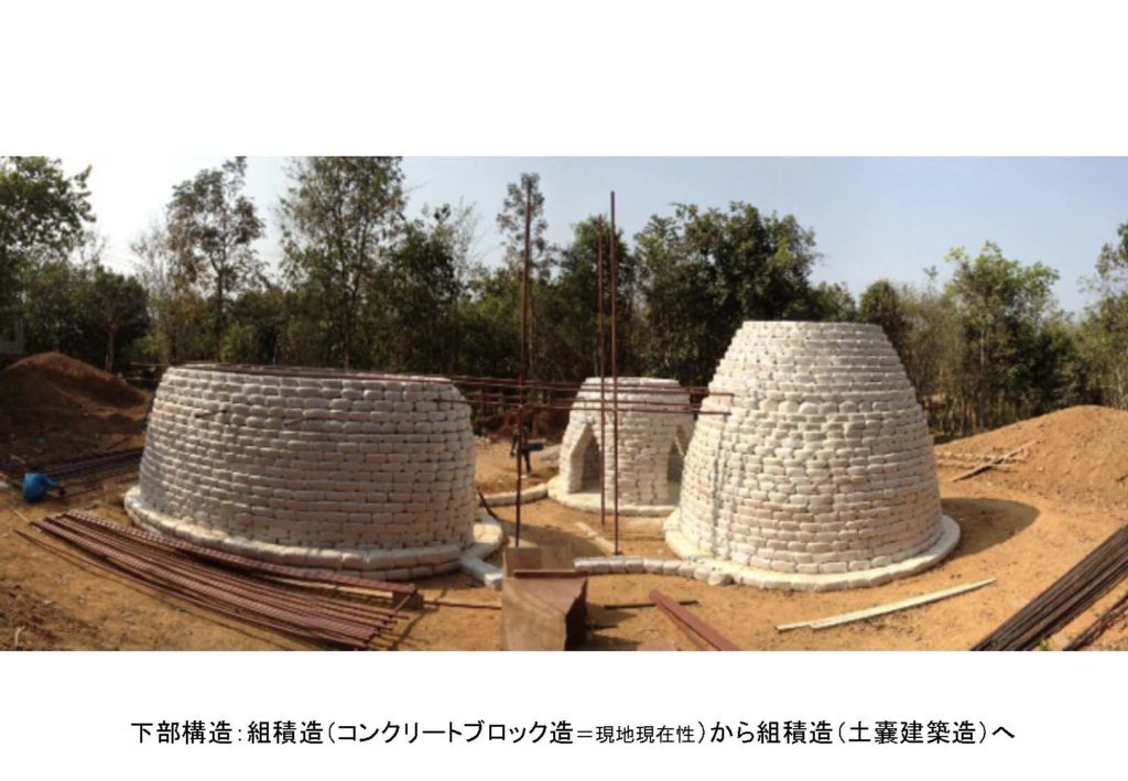 あと、機能的なことですが、この建物は断面ゾーニングしてまして、お祈りをするところが左の方の土嚢ドームと上の空間です。逆に勉強するとこは右の方に分けてるんですが、 何を言いたいかと言いますと、先ほどの地球感受の空間って実は2つあって、この右の方は水平方向に空に抜ける空間があるんですが、この両者が地球感受の空間として成り立っていて、それがお祈りの空間でもあります。 なので、朝の祈りの場は土嚢ドームで行って、夜は上で行うということで、要は、地球を感受するとは、元々垂直な開けを得る空間なので、祈るという概念とイコールなわけですね。この場合は、さらに機能としてお祈りをするということを完全に重ねてしまって、地球感受ということと祈るということが完全に重ねあうような様態にしています。あと、補足なんですが、実はこの天翔ける方舟ができる前にコンクリートブロックのお家は散見されたんですが、これができた後にですね、下部コンクリートブロックで上部木造みたいな家がちらほら見えるようになりました。これは確実にそれが影響したとは言い難いんですが、ただし、建設当時にはなかったので、やはりああいった建物があって、それに何かしら影響を受けた場合に、こういったことができるようになったのかなっていう風に推測しています。 ですので、何か個別的なものが単にできたというよりは、あの地域で建築の工法の更新がささやかながら図れたのではないかという風に捉えています。