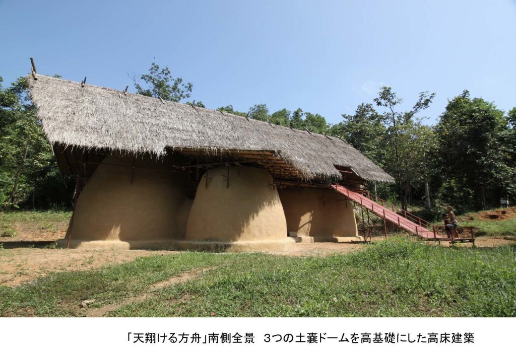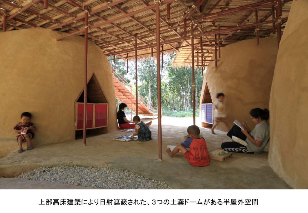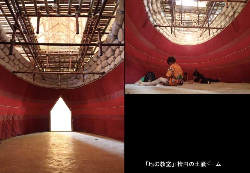 結果できた空間ですが、見てくれは先ほどと一緒で、下部が3つの土嚢ドームで、上に高床部が乗ってて、滑り台が滑り降りています。ドームのうちの1つには民族意匠で被覆をして、そこでお絵描きなんかをして、地の教室と呼んでる場所があります。 その上部は高床部で主に竹によって被覆された床と壁があって、草葺きの屋根があるところがありまして、これは高床の空間です。地球感受の空間ですが、今まで大地と天が繋がりますっていうことをずっと言ってましたが、 ちょっとありようが変わることがあります。何が変わるのかということですが、 タイのもう凶悪な太陽の日差しを日中、見上げても、「太陽の恵み」って絶対思わないですっていうのがあって、目が焼けますし、あるいは、どちらかというと憎らしい感じが日中はあるわけです。そういうことが反映されているからかタイでは洞窟信仰が盛んで、洞窟内にタイの仏教寺院っていうのはよくありまして、こういった地球の感受の仕方では大地がベースで、上からほのかに光が差し込むみたいなものが地球感受のあり方としていいんじゃないかということを考えたわけです。それは土嚢ドームに託しまして、いわゆる洞窟的な空間が必然的にできるような土嚢ドームなんで、それでもって洞窟を表現して、その上から、 非常に明るいですが、実は間接的にハイサイドライトの光が漏れてます。これを地球感受の空間としています。