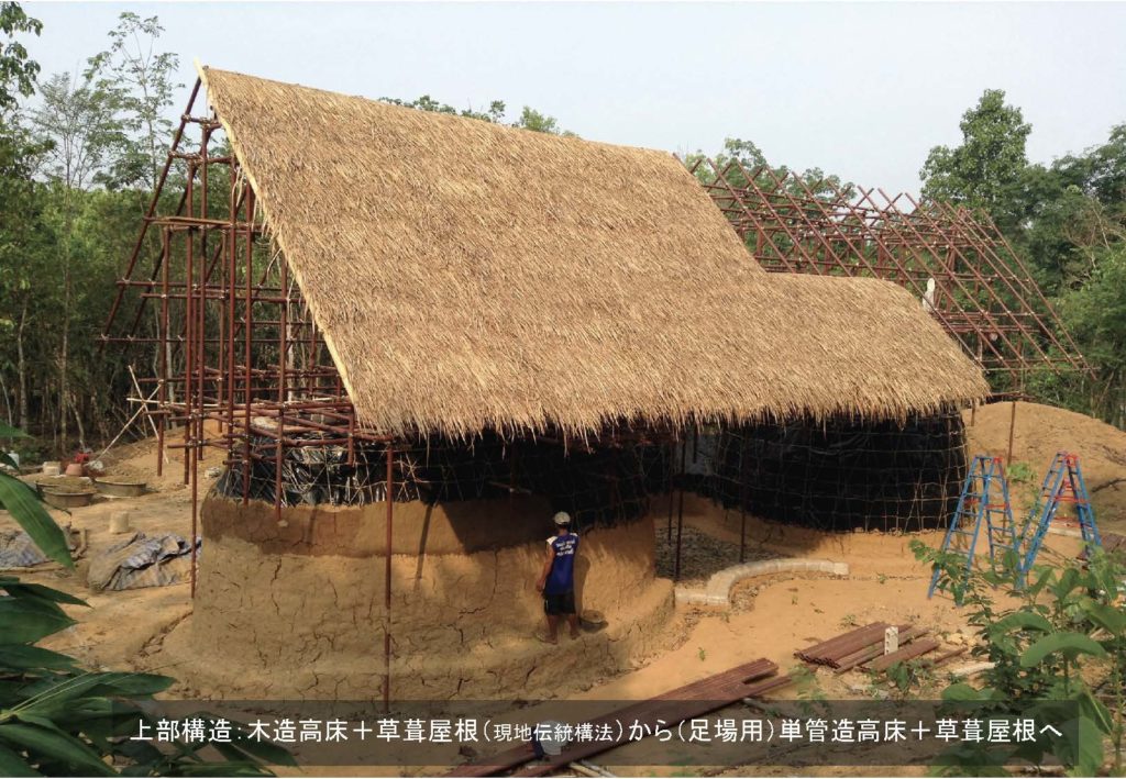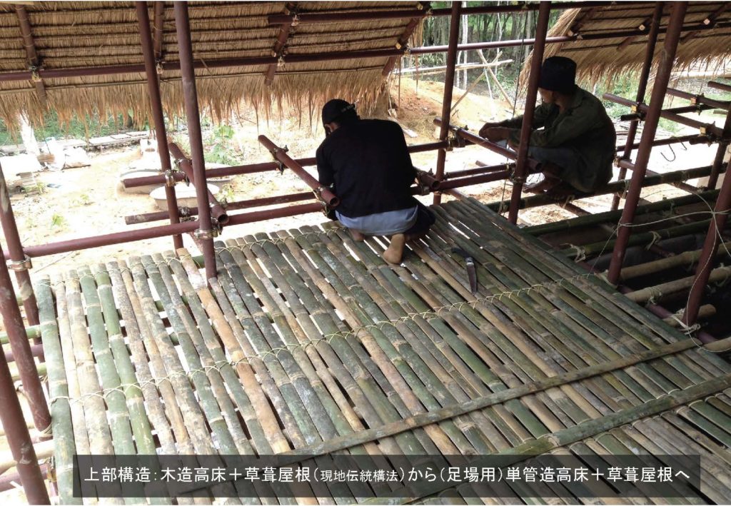 次に、フィールドの読解で、どういう風な価値でもってあの建築を見たのかってことですが、これは伝統的な構法と現代構法の混成を行いました。先ほど同じような図ですが、組積造を導入するというのは、「コンクリートブロックの家があるね」ってことで、現在性の反映です。上部構造ですが、単管を使うというのはもうこれ現在性の反映で、ただし、草ぶき屋根だとか竹の床を使うというのは伝統的な構法で、そういったことの合わせ技によって建築構法の更新を図りました。下部構造の土嚢ドームですが、これが基礎を兼ねるので、単管のこの華奢な材ではこれだけで活用するのは構想的に難しいから、高基礎を兼ねさせました。上部構造は足場で組んで、そこに草葺き屋根を葺いています。 床は現地の方が竹を加工するのは非常にうまい。これは農家の方なんですが、ここの成人は鉈1本で竹を操れるようにならないと成人とみなされないみたいなので、全員がむっちゃうまいです。なので、僕はなんもできないので、現地の方がすっとこれやってくださったので、そうやって高床は吹いたという話があります。