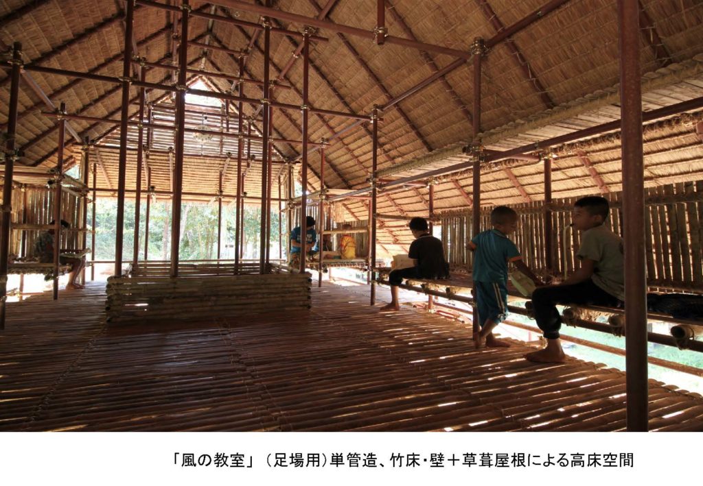 結果として何をしたかですが、この組積造、現在見られる構法というものをコンクリートブロックじゃなくって、それを自分たちで作れる土嚢の建築に読み替えて、下部構造はつくって、上部はですね、 実はタイってバンコクがメガロポリスなので、こういったミャンマーとの国境でも、金属足場っていうのは簡単に手に入るという面白い状況があって、構造は単管でやることにして、その代わり、現地で今でも手に入るこの草葺きの屋根マットみたいなものだとか竹のマット、おばあさんたちが内職でこれ作ってるので、そういうのが今でもありましたから、それを使うということにしました。