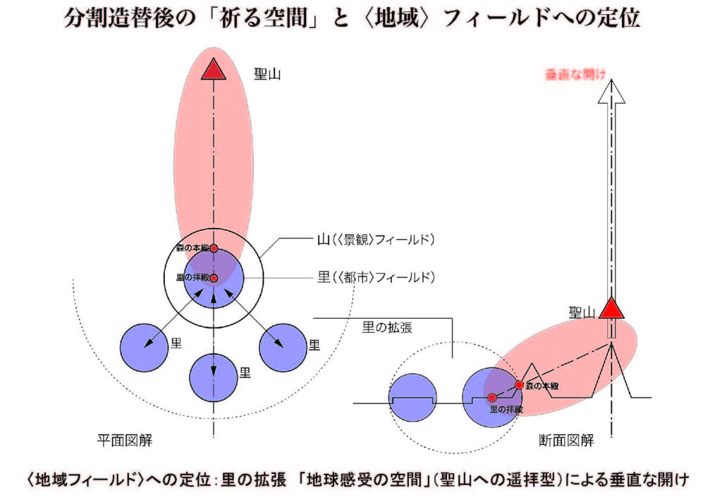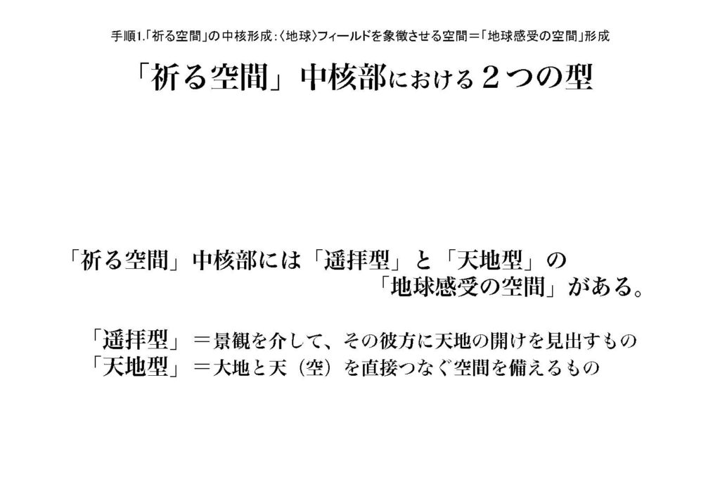 まず1つ目の前にですね、「祈る」空間について、いきなり言ってもわけわからないので、 どういう風にやっていくかですが、手順が2つありまして、まずは「祈る」空間、中核となるところを作るということで、これは地球感受の空間を作っていきます。 次は、そんなものが真空中に浮いてもしょうがないから、地域の中にそれをどう置くのかっていうことがとても重要になってきます。中核部を地域フィールドに定位させることが必要になります。中核部に関しては、大きく遥拝するタイプと天地型、天と地をダイレクトにつなぐやつの2つがありまして、それについて説明をしたいと思います。