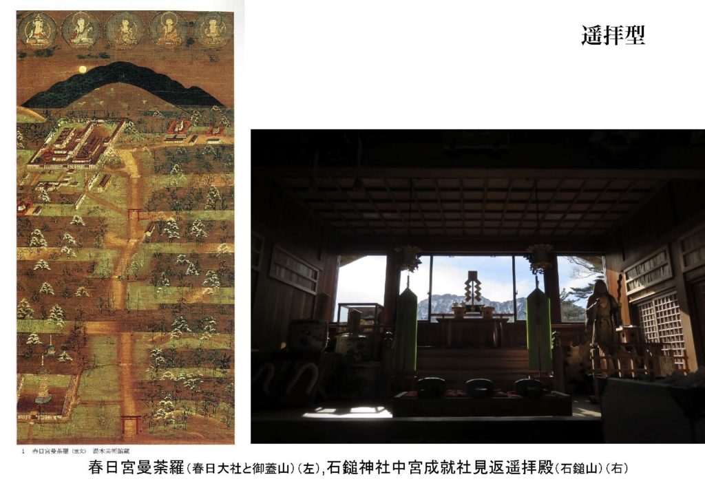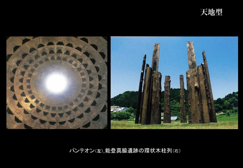 まず、遥拝型ですが、日本の神社はこれが得意でして、例えば左の春日大社、 社殿は変な向きに向いていますが、社地の背後に御笠山があって、その山の端から神様が出てきてるということで、山を遥拝するようなことで神を感受するみたいな話で、こういったものは現在でも具体的に体験できるのが右の写真の石槌神社の中宮成就社の見返遥拝殿というものですが、社殿の後ろにおっきな開口が開いていて、 そこに神体となる石槌山が見えて、空に通じていくというものがあります。逆に、天地型というものはもうこれは大地を囲い込んでそのまま上に天への開きを作っていくようなもので、有名なものはローマのパンテオンがありますが、 日本の縄文時代のもの能登の真脇遺跡のようなものも、大地に円環状に木の柱を立てて、 大地と垂直に空を突き刺して天と地を直接繋ぐようなものだと思っています。