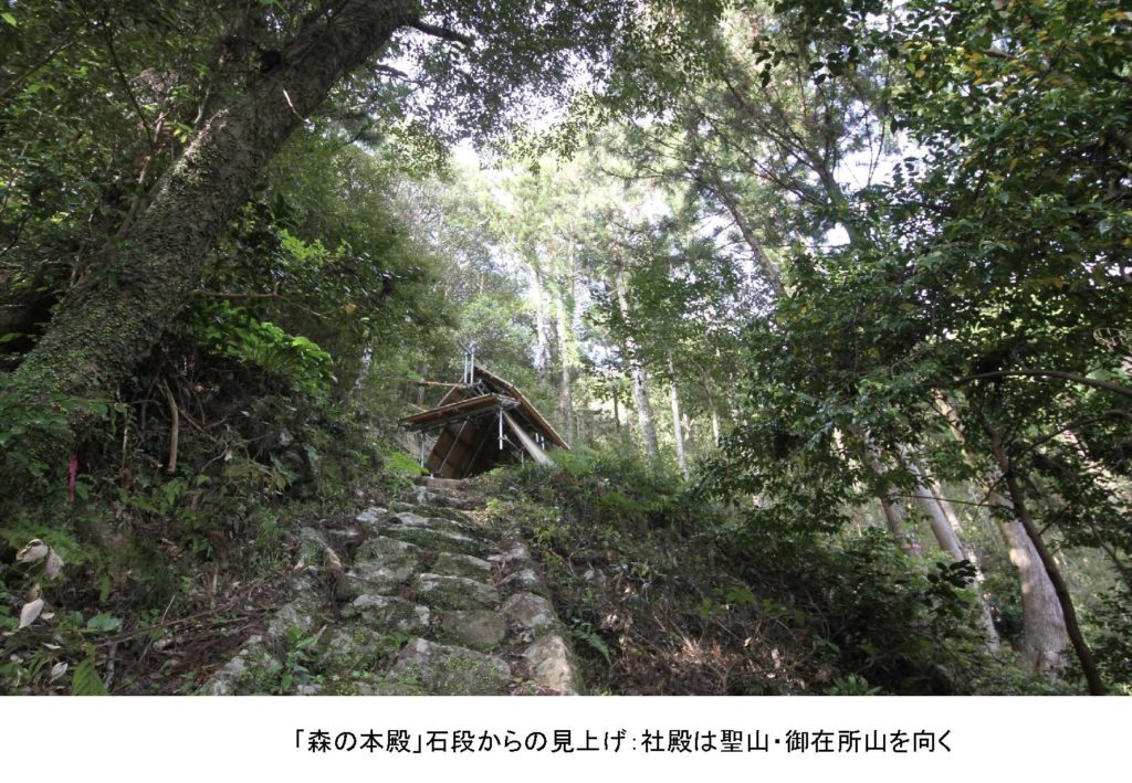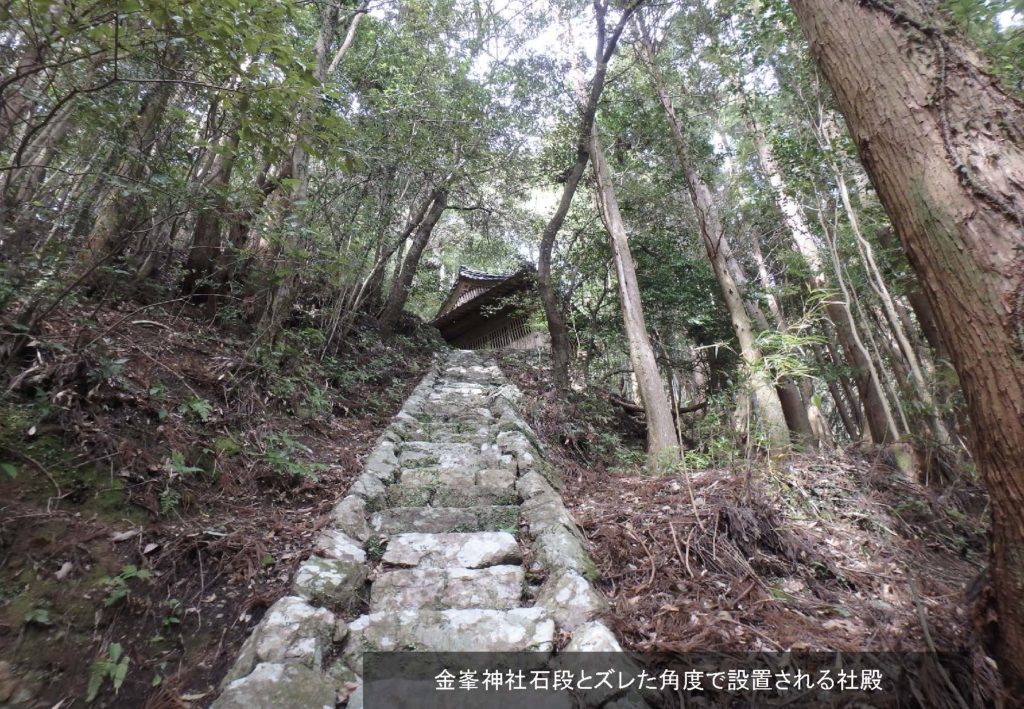 この神社ですが、存続を望むということは「やばい」ってことですよね。実際は、2014年に台風が来て、結構大破してですね、礎石から柱がずれ落ちて開かずの社殿になって しまっていたということがあります。ただ、中には江戸時代に建てられた春日造りの社殿があって、これ含めてどうにか守っていかなきゃっていう状況があったわけです。金峯神社は、実は空間的な特色がすごくあって、極めて急な石段からの山道から社殿を見ると、 奇妙にずれた角度で社殿が配置されてるのが誰が見てもわかるかと思います。これを調べたらですね、単にずれてるんじゃなくって、この社殿の向きは10キロ先にある聖なる山の特に修験道の聖地である御在所山を向いてることが大学で測量等をやってる研究室の測定によって分かったわけですね。ということで、この社殿は谷の水源地にあるだけじゃなくって、 10キロ先の聖なる山を信仰対象に遥拝する空間なんだっていうことがわかったわけです。御在所山はこんな山容で、地元では「おっぱい山」とか言われてるんですが、こういった遠いところにあるものを拝む神社でもあったということですね。 こういった状況を把握してどう社殿を再編するかですが、以下のような方針を定めました。