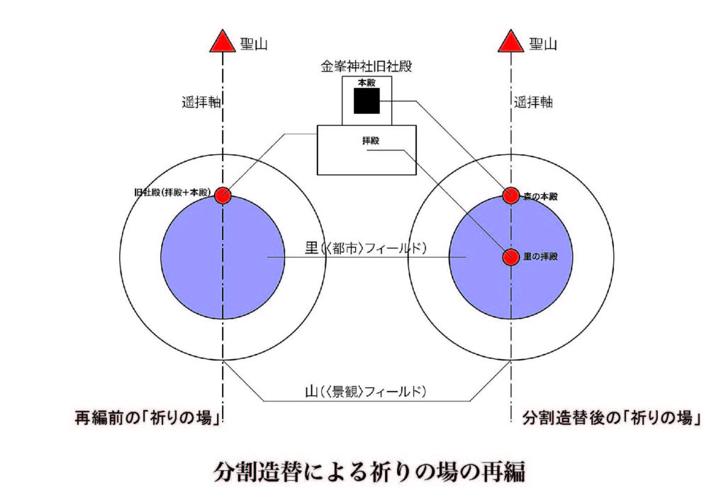 元来は軸線ってこのように作っちゃダメで、このように聖なる信仰核から延長されたところに社殿とか神社の境内を置いていくものなんですが、 これを逆手にとって、何の意味もないバブル期の経済の失敗みたいな軸線に社殿を合わしているということをやや皮肉も込めてやっています。