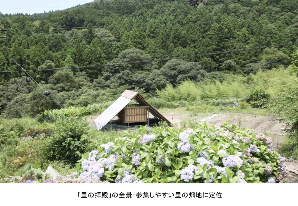 事例ですが、まずは既存の「祈る」の空間を更新していくものとして金峯神社を紹介します。 これは実際ある神社を更新したもので、大学の近所なんですが、高知県香美市土佐山田町にある神社のお話です。 この神社なんですが、谷の棚田集落にある氏神様で、それを反映して、神社の社地は谷の水源の辺りにあります。その水源が信仰されるという非常にノーマルなあり方です。あとこの神社ですが、明治の神仏分離までは座王権現宮と言いました。座王権現とは吉野にある金峯山寺の本尊が蔵王権現ですが、要は吉野系の修験道と何か関係があるんじゃないかということが伺えます。あと村ですが、明治初期までには、9軒氏子さんたちがいました。ただし私が関わった時には、 1軒どころか1名しかいなくって、消滅寸前集落でした。ただし、ここに希望が若干あるのは、元々の氏子さんがどっかめっちゃ遠いとこに行ってるんじゃなくって、近隣の村落には居住してるということがあったので、この1名だけじゃなくって近隣には、引っ越した人も神社が続くことを非常に強く望んでいたということがありました。
