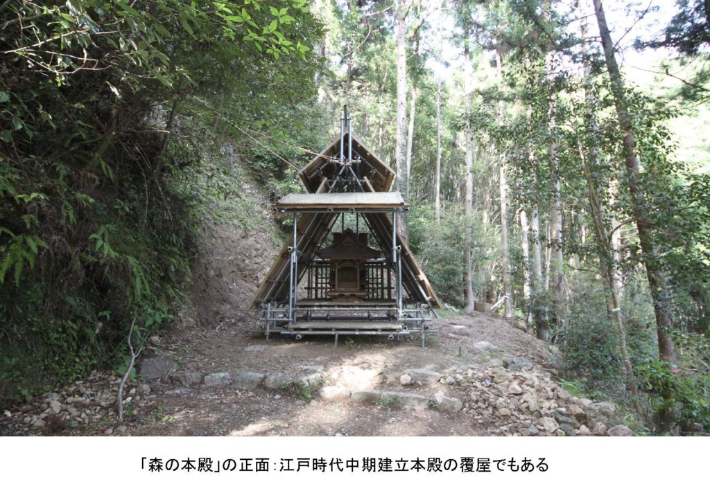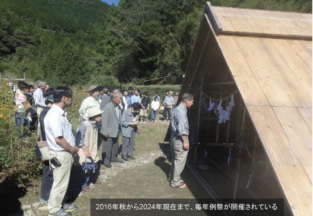 里の拝殿ですがお金が全くないこともあったので、単管で作って、あと研究室で僕を含めて施工してですね。材木は知り合いの大工さんから割と安く譲っていただきました。 出来上がったものがこれで、ここがどこを向いているかというと、この棟のところが御在所山をまっすぐ向いています。このことで、これが何を拝んでいるのかわかんないってことがなくなるようにしています。 本殿の方ですが森の中に作り上げたもので、紆余曲折を経て、最終的にできたのは2024年なんですが、 金峯神社の名物である石段から変な向きを向いている風景が復活しています。これは上から見下ろしたような図になります。江戸時代のこの社殿はこう収まってるんですが、春日造りの社殿を、一回り大きくしたような、春日造りの大屋根被ってるような状態で。これも御在所山の方を向いています。このようにしたことによって、10年も途絶えていた祭りが復活しまして、これが、1人だけの氏子さんなんです。これが、近所に住まわれてる旧氏子さんたちです。 あと、高知工科大学はこの件に関わったので、普通に大学生も来てますね。里に拝殿を持ってきたことで、もう不可能と思われていた祭りが復活して、今までに9回やってるのかな。毎年、例祭が開催されることになりました。