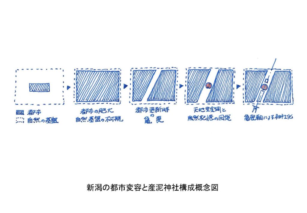 基本的に、自然の基盤の中に都市の領域が限定的にあるのが都市の健全な状態ですけれども、都市なんていうのは京都も含めてどんどん変わります。 なので、変わるのはいいとしまして、現在のように都市が肥大化しすぎてしまうと、基盤がなんなのか全く見えなくなってしまう。なので、産泥神社は新潟の「水と土の芸術祭」に招待されて作ったものです。元々新潟は水と土しかなくって、そこへの飽くなき格闘の末に現在の繁栄を手に入れたんだってことがあるんだけれども、 その根源をほぼ思い返せないので、それが思い返せるような場を作ってほしいっていうのが、芸術祭全体のテーマでした。この状態の時に、柳都大橋というものと当時の頓挫があったおかげで、なんか市がぶち切れたような状態ができているということになります。