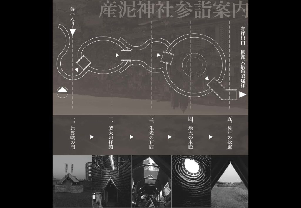 産泥神社の空間ですが、参詣図があってこれって本殿も入れる神社で、普通入れないんですが、江戸時代の「行動的空間」のようにクネクネと曲がって本殿に入って、最後はまた捻れたドームから出ていきます。これが全景で冬の時の景色ですが、こう入って、拝殿があって、石の間があって、本殿があって、あと、柳都大橋の切れ目があるということなのですが、参道、拝殿、石の間があって、天地型の本殿があって、そこから抜ける出口はねじっていて 出口の切妻の軸線との柳都大橋の軸線がピタッと重なるようにして、 社殿から出る時に俗なる軸と一致することで、現代の新潟市に戻ってきたみたいな感じにするようにしています。
