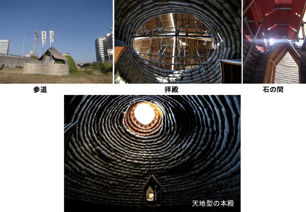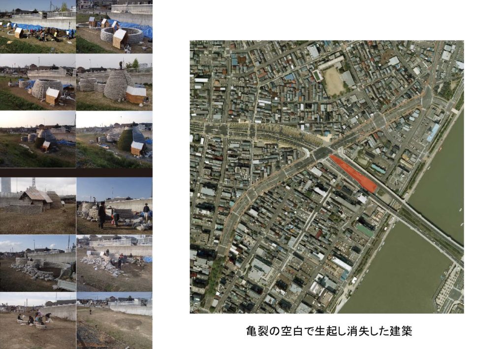 あとは、この作った空間だけでこの神社を創生したというよりは、この空地は新潟の方たちに聞いたら「誰もこれ気に留めない場所だよ」って言っていて、「あんなところで作るの」って言われたんです。そんな場所でですね、土嚢がどんどん積み上がって、何かわけわからないものができていって、3月になると、潰しているみたいなのがあって。記憶喪失みたいになってる大都市では、何が建って何が消えて、今自分はどこにいるか全くわかんないようなことがあるんですけれども、 誰も気に留めない空き地っていうものを見つけて、そこで建設が起こって、ある時に解体されたみたいなことで、 みんな「あんな場所があったのか」っていうことを思い返したらしいです。もう今この建物ないんですけれども、何かしら現代都市で都市化の飽和みたいな状態の時に、こういう神社みたいなものがあればいいんじゃなかろうかなっていうことをこれが終わった後も考えています。